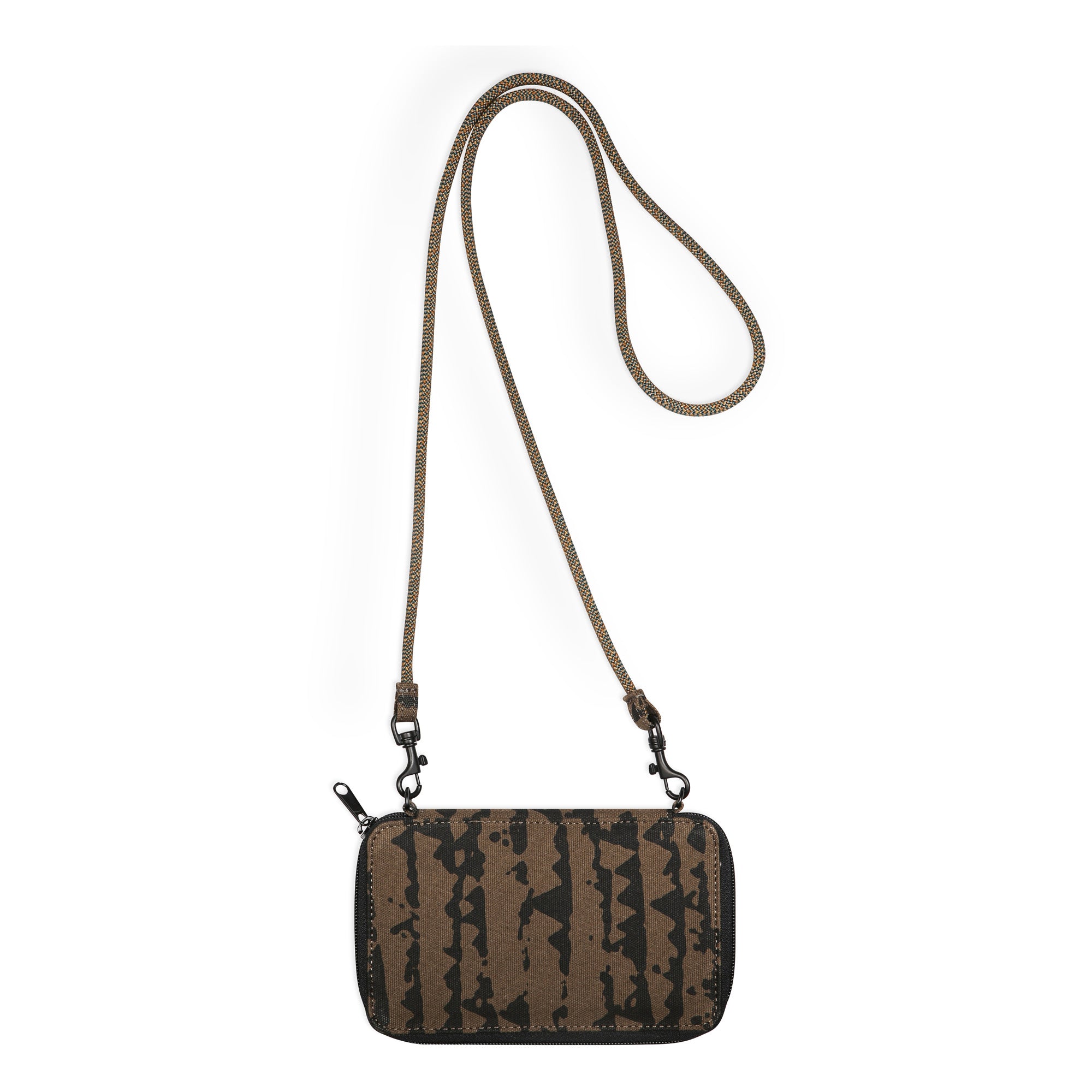 This cross body bi-fold wallet case features a fixed rope shoulder strap that can detach with metal spring hook hardware, one main compartment with zip closure, internal zip pocket and multiple internal cash, card and ID slots. It's go time!