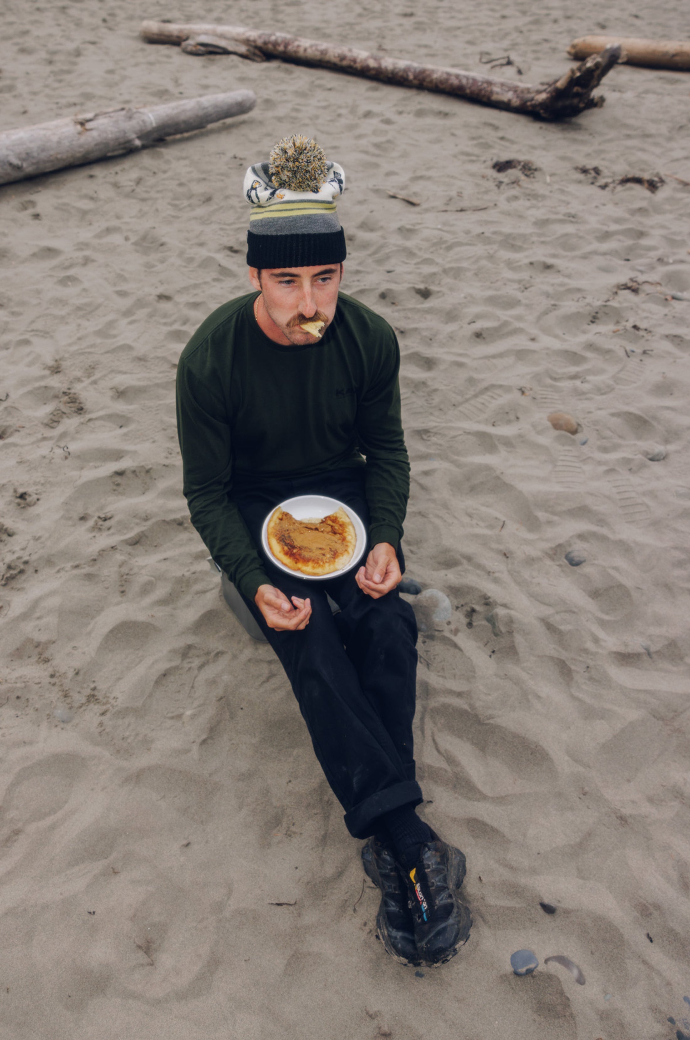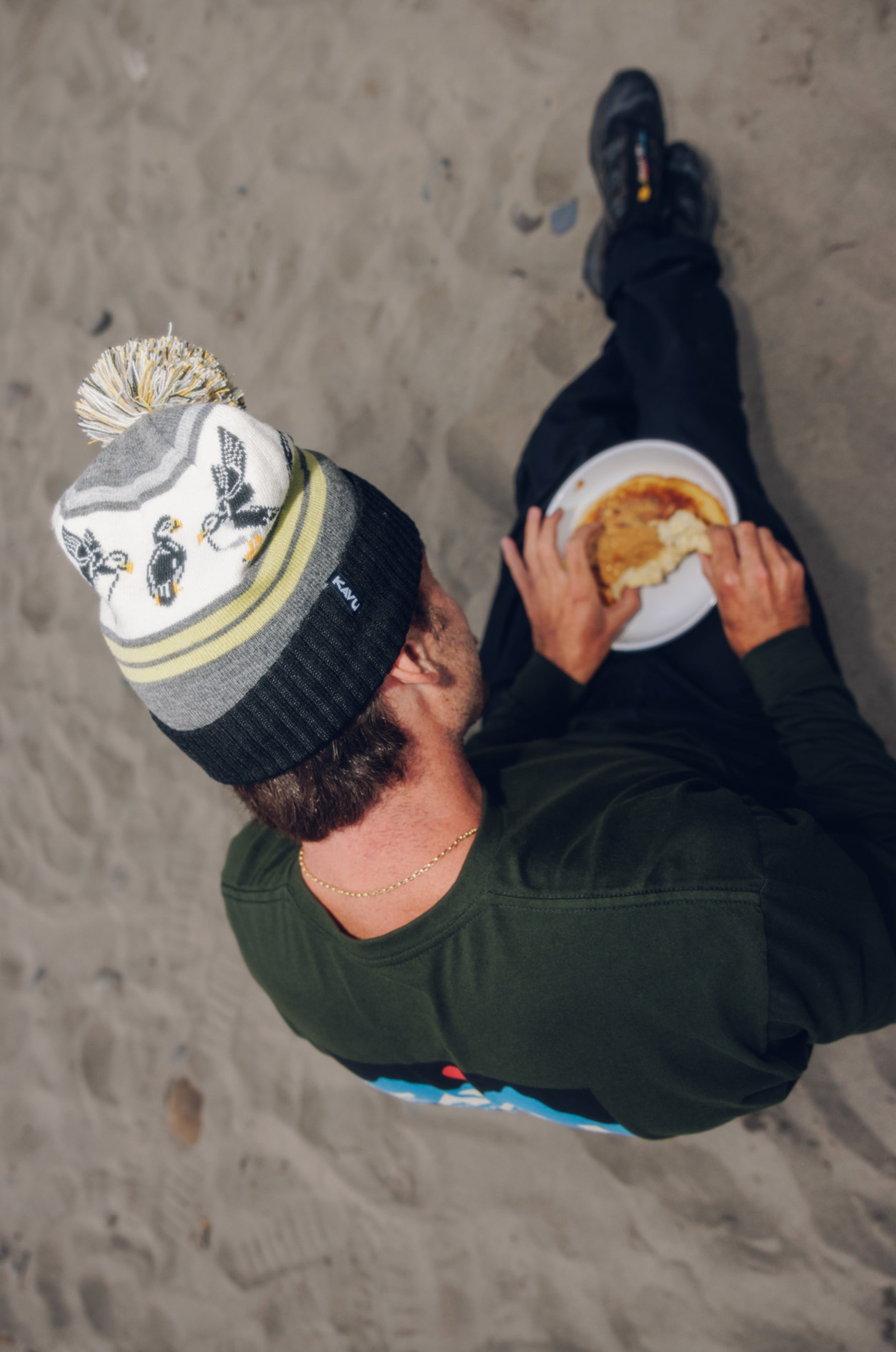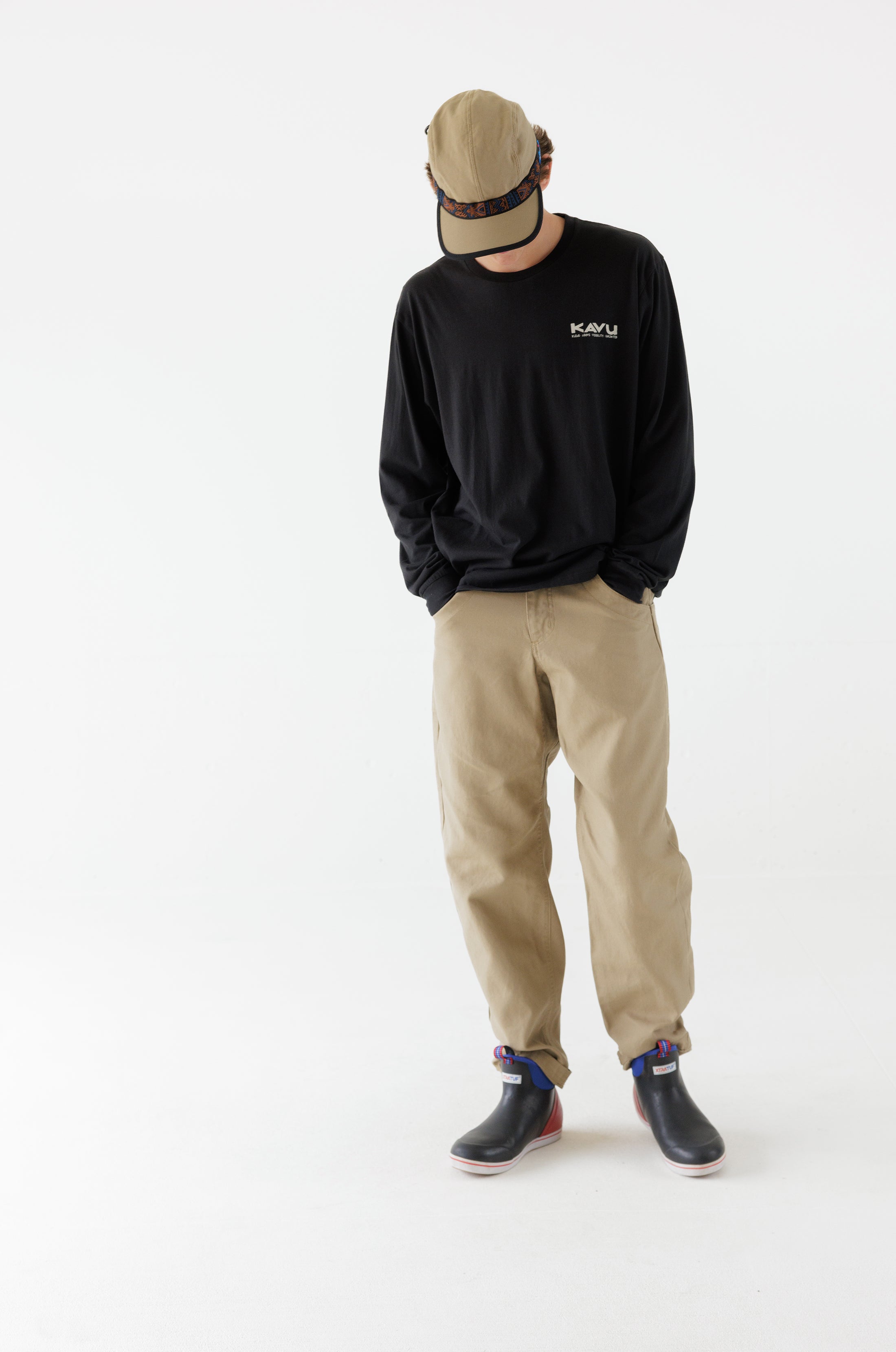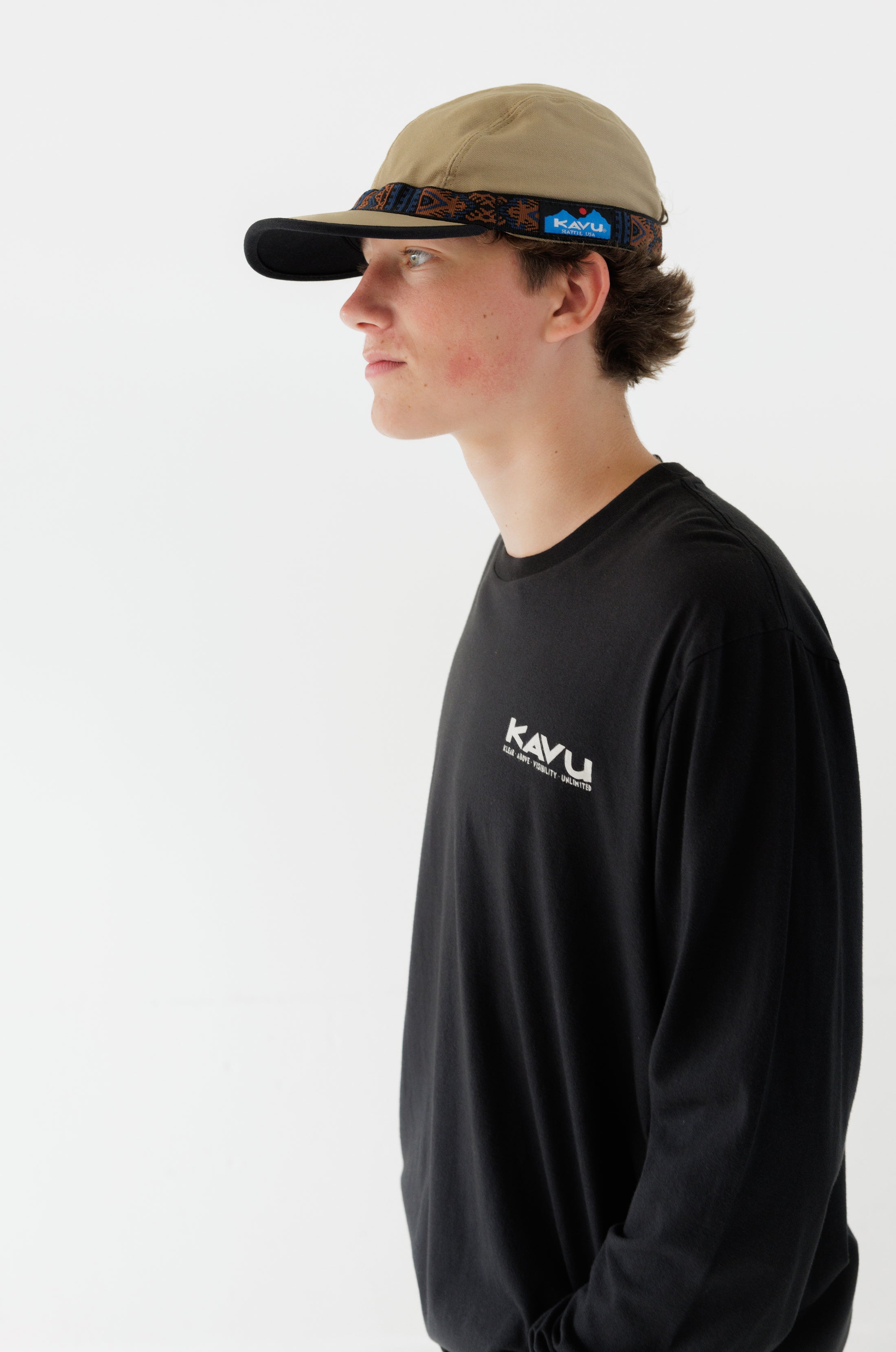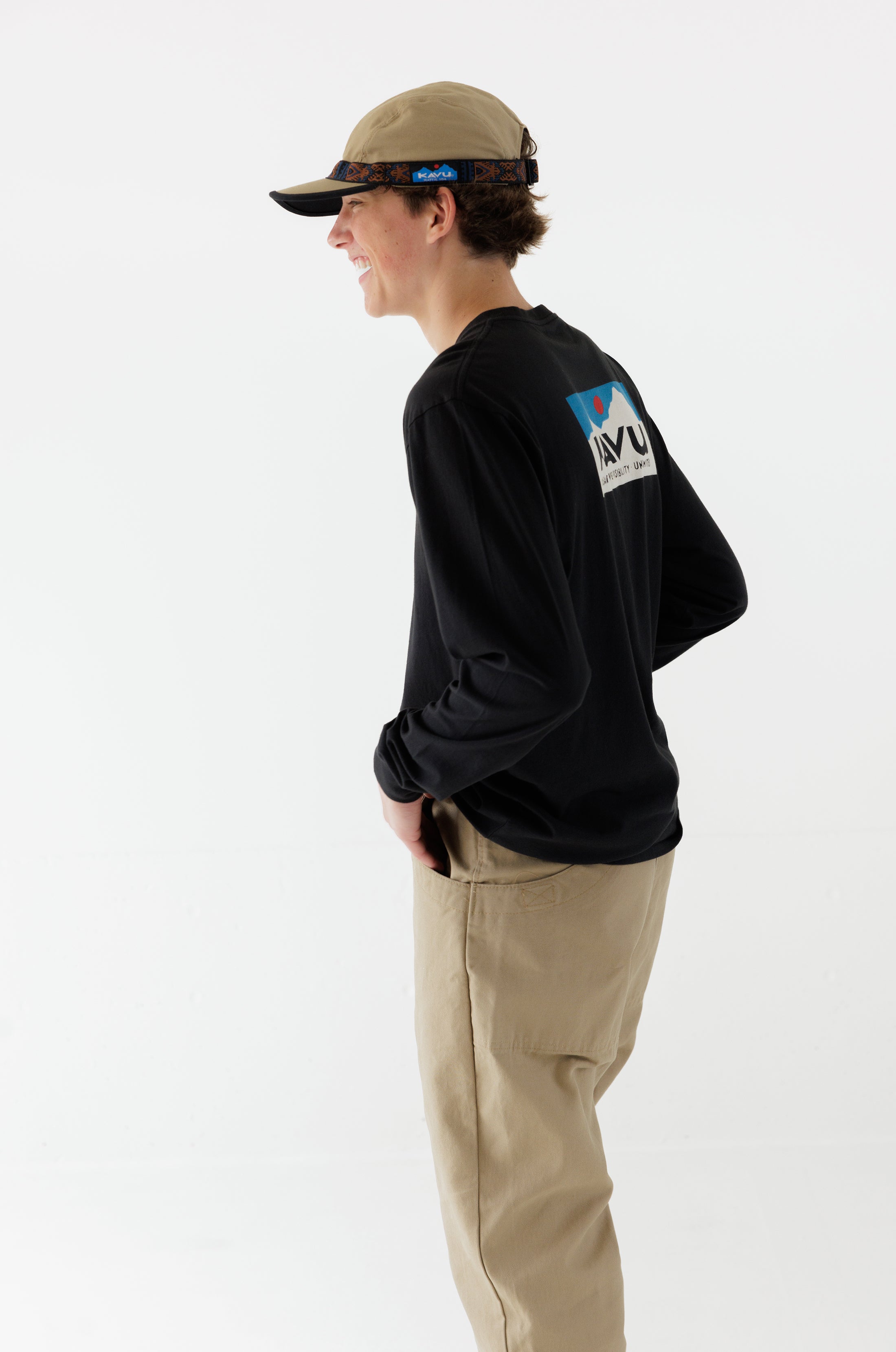 This is the Long Sleeve Klear Above Etch Art T-Shirt—a super-comfortable everyday tee made from 100% organic cotton. On the front there’s a little logo, then on the back there’s a big full colour one—both nod to our name, and the story behind it. For those unaware, KAVU stands for Klear Above, Visibility Unlimited—an aviation term that basically means it’s going to be a great day for flying. It goes without saying every day is a KAVU day with this tee on.