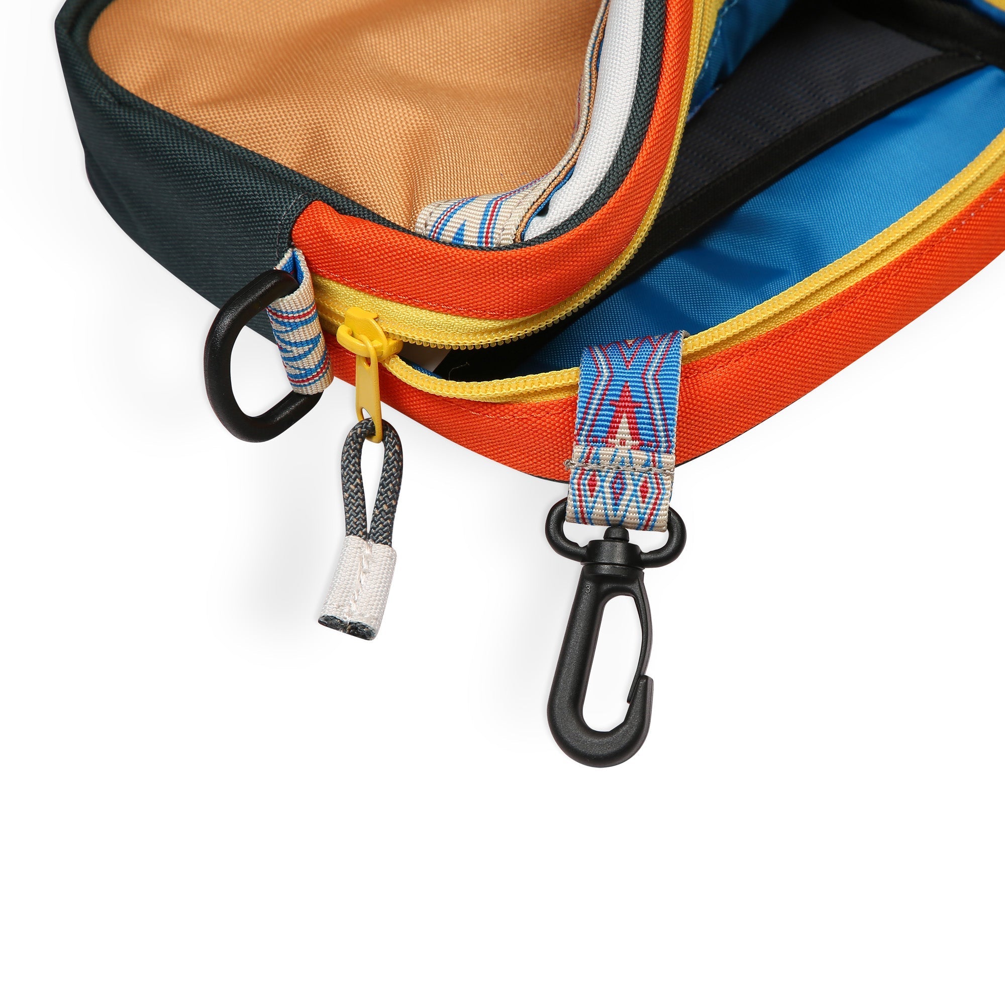 • Mesh stash pocket and pattern webbing key fob clip loop