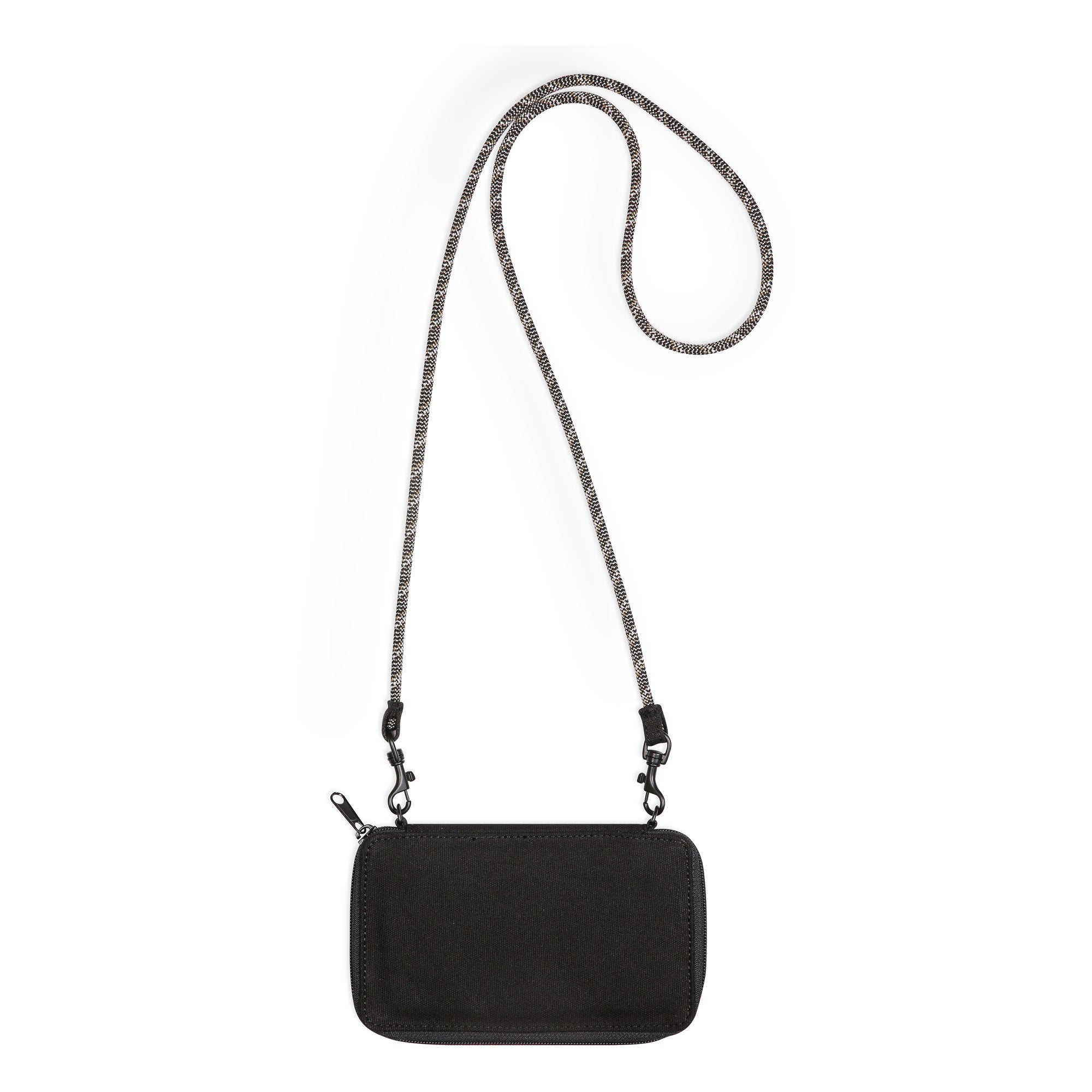 This cross body bi-fold wallet case features a fixed rope shoulder strap that can detach with metal spring hook hardware, one main compartment with zip closure, internal zip pocket and multiple internal cash, card and ID slots. It's go time!