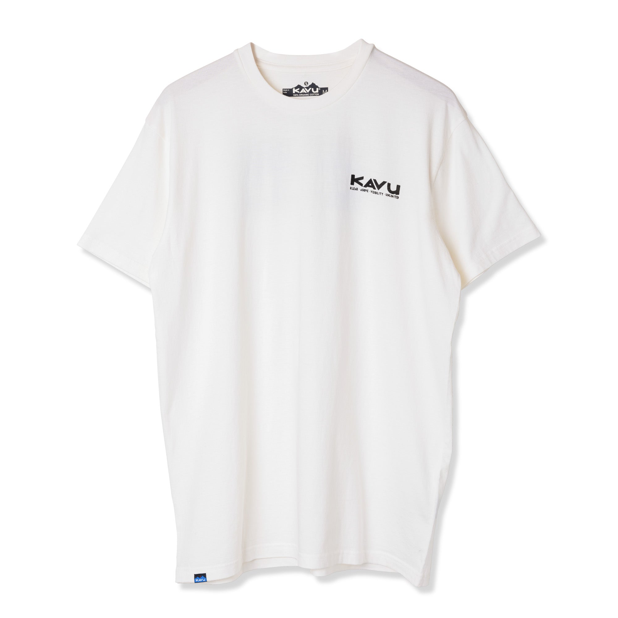This is the Klear Above Etch Art T-Shirt—a super-comfortable everyday tee made from 100% organic cotton. On the front there’s a little logo, then on the back there’s a big full colour one—both nod to our name, and the story behind it. For those unaware, KAVU stands for Klear Above, Visibility Unlimited—an aviation term that basically means it’s going to be a great day for flying. It goes without saying every day is a KAVU day with this tee on.